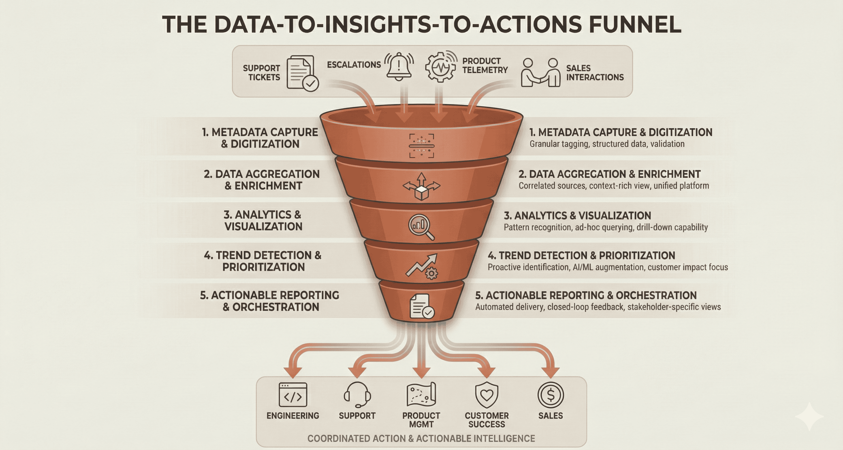 The architectural challenge isn't collecting more data. It's building a pipeline that transforms unstructured interactions into structured, actionable intelligence that flows to the right stakeholders automatically.