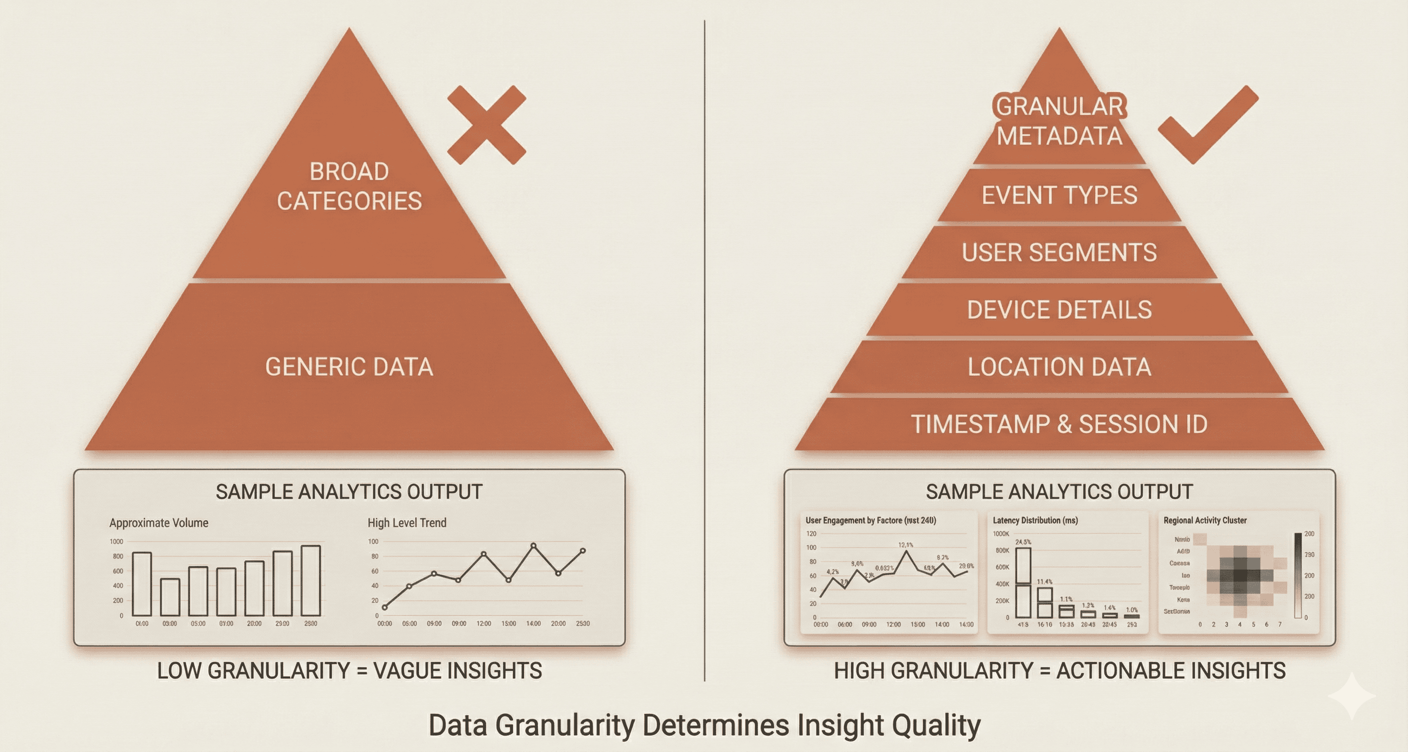 The depth of your downstream analytics is bounded by the granularity of this capture layer. Broad categories yield broad insights. Granular metadata enables precise root cause analysis.